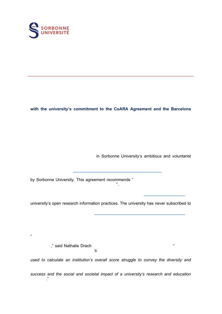 "As of 2026, Sorbonne University will no longer submit data to the Times Higher Education (THE) World University Rankings. The decision comes as part of a wider approach to promote open science and reform research assessment, in accordance with the university’s commitment to the CoARA Agreement and the Barcelona Declaration. Sorbonne University is choosing open and transparent databases to assess its academic performance."