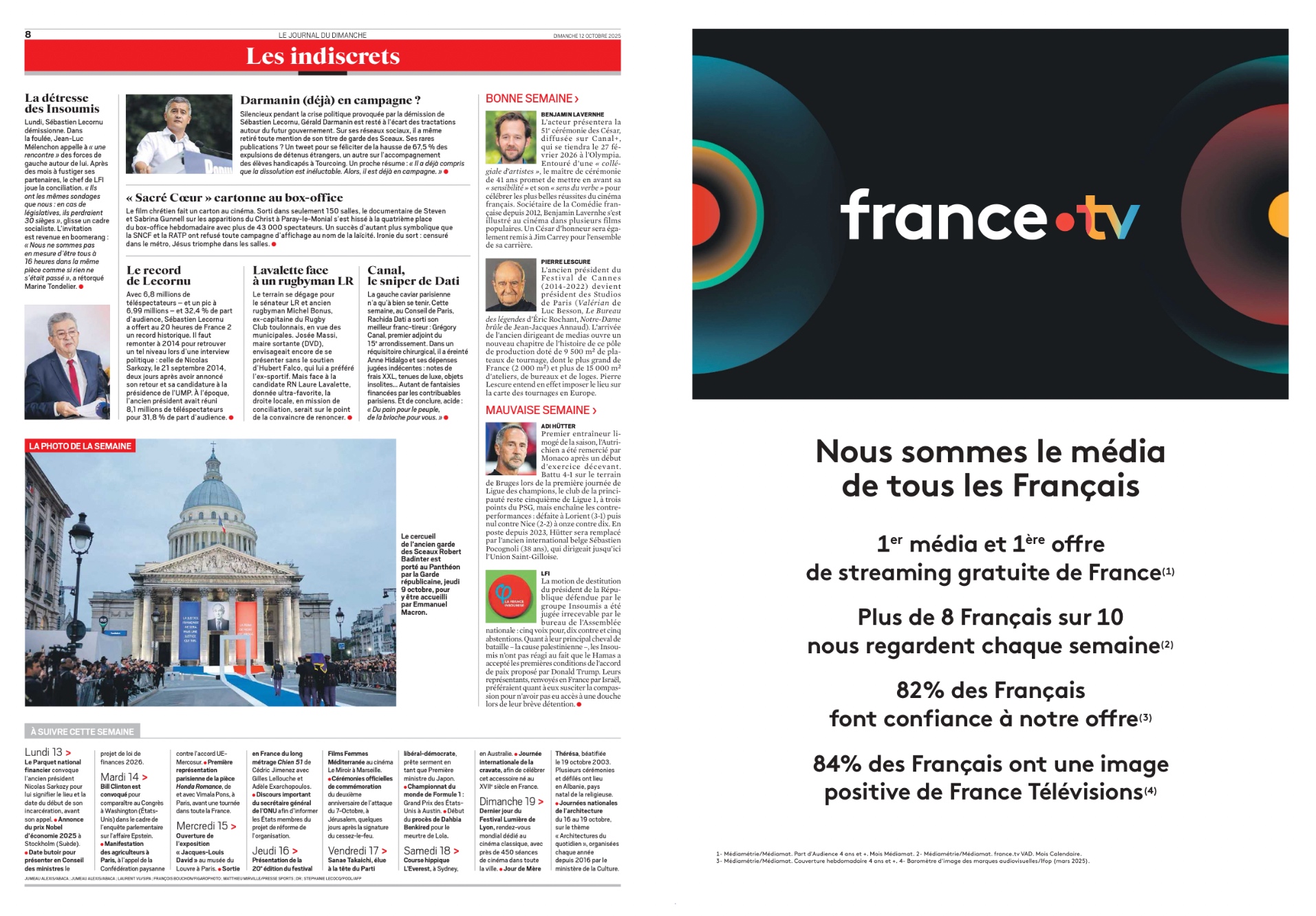 Je ne sais pas ce qu'espère @francetv.bsky.social en se payant une pleine page de pub dans le JDD. S'acheter une accalmie dans les attaques déloyales et mensongères que la bollorosphère continuera malgré tout de déverser sur l'audiovisuel public ? Poke @slpng-giants-fr.bsky.social